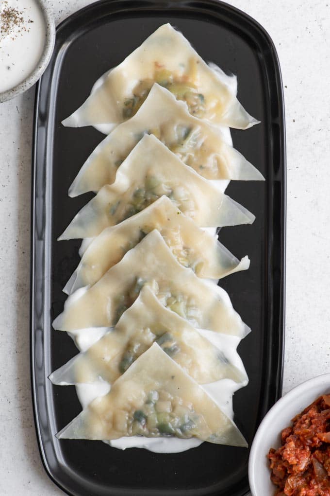 2. Taking one filled wrapper at a time (either in your palm or on the counter, whichever is easier for you), dab two edges of the wrapper with water, then fold in half and seal, squeezing out air as you do so. Set aside and repeat until all dumplings are formed.