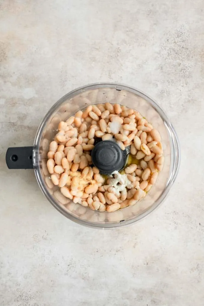 - In a food processor combine the beans, 2 tablespoons of olive oil, lemon juice, onion powder, garlic powder, and salt. Process until smooth, adding cold water, aquafaba, or more olive oil to thin if needed. Let it process for several minute, pausing to scrape down a few times. Taste and adjust salt and lemon juice if needed.