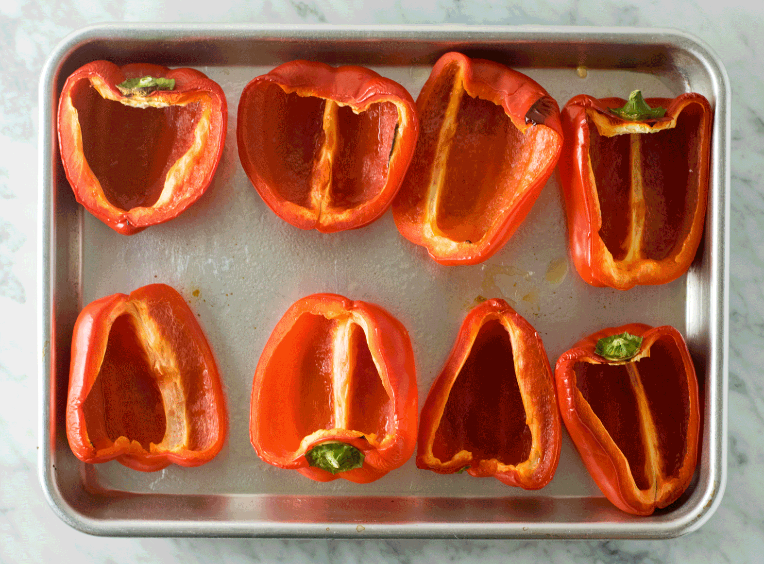 - Prepare the bell peppers by cutting them in half, cutting around the stem to leave it intact on one side. Remove all seeds and white pith. Place them cut side up on an oiled baking tray.