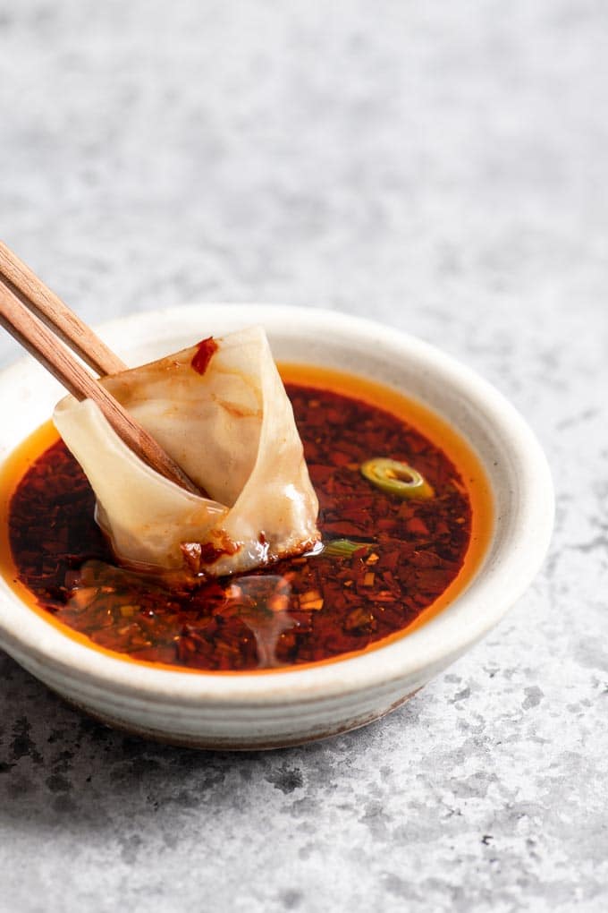 This fiery dumpling dipping sauce is loaded with flavor. Full of chiles, garlic, and ginger, with just the right amount of saltiness and a hint of sour to balance it out.