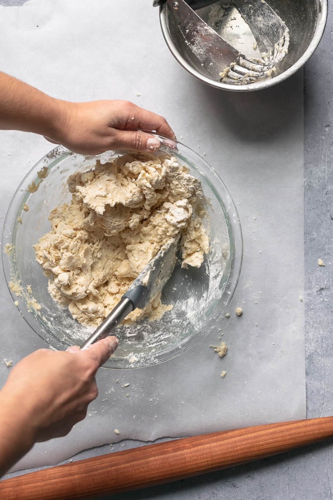 If you don’t have a pastry blender, I recommend picking one up, they’re cheap and useful! But if you don’t want to do that you can use two butter knives and cut across the dough in opposition to create the same effect. It is, of course, more work. I’ve done it though when traveling and when in less well-appointed kitchens.