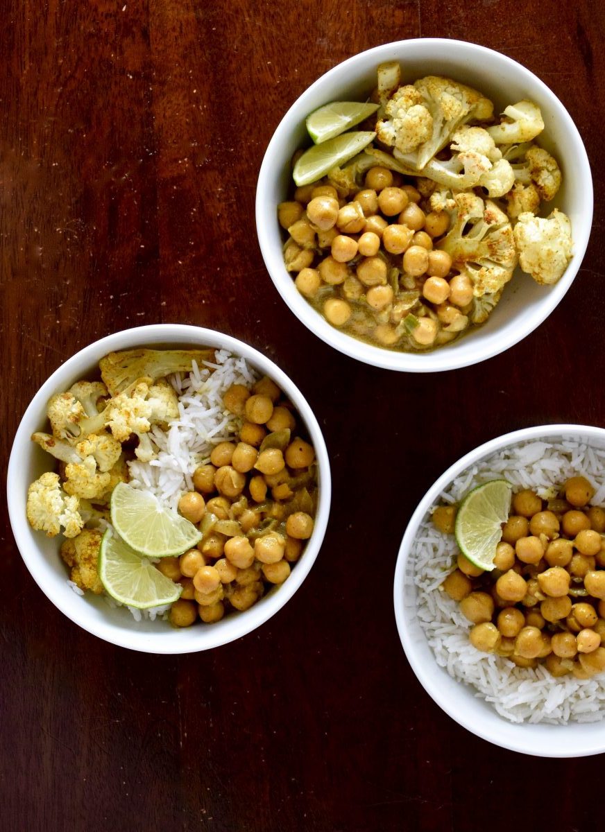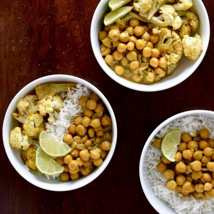 Curried chickpeas and roasted cauliflower and served over basmati rice in this delicious, healthy vegan meal.