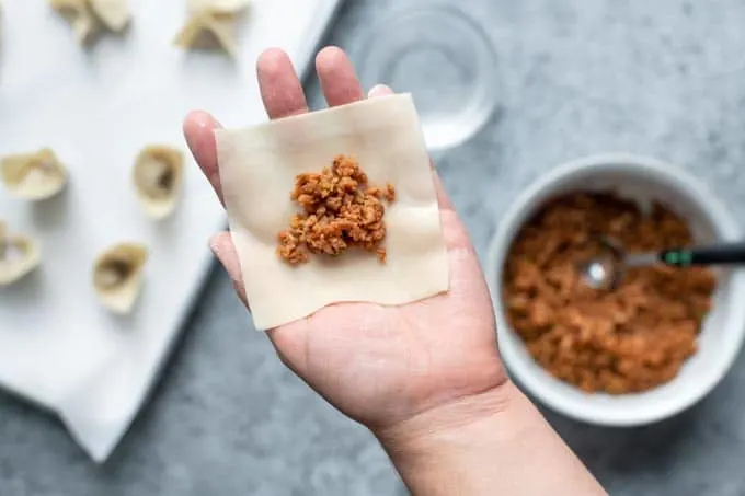 - Shape the wontons: Place a wrapper in your palm and fill it with about 1 teaspoon of the filling. Rub water along the edge of the wrapper then fold the dumpling in half to make a rectangle. Add water to the bottom two corners, then bend them together to touch. Press to seal while pushing out air from the dumpling.