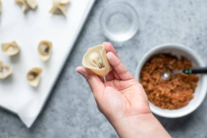 So this is a classic “fancy” wonton folding shape. But it’s easy!