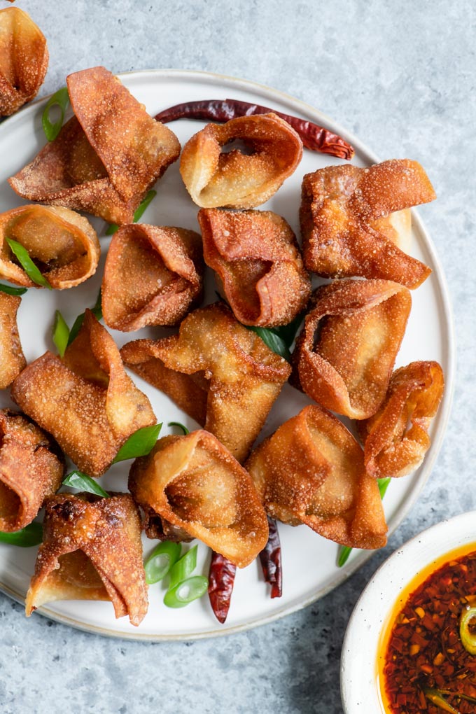Wontons can be deep fried, they can be steamed, heck they can even be boiled! My favorite is a pan fry and steam combo. The bottoms of the dumplings get crispy while the wrapper gets deliciously chewy!