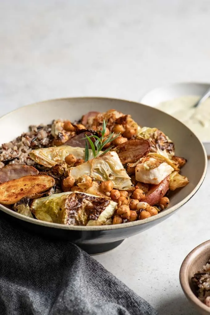 This easy, simple, and nutritious vegan sheet pan dinner is perfect for lazy weeknights and slow Sundays. It’s got cabbage, potatoes, and chickpeas, tossed in a mustard vinaigrette and dressed up with a creamy tarragon gravy. Serve with some rice or bread and you’ve got a dreamy and nourishing meal!