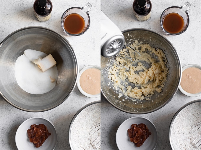 - In a large mixing bowl or a stand mixer beat together the vegan butter and sugar until light and fluffy. Add the prepared vegan egg replacer (equivalent to two eggs) and beat to mix together. Add the boiled apple cider, apple butter, and vanilla extract and beat to combine. It may look a bit split at this point but that's ok.