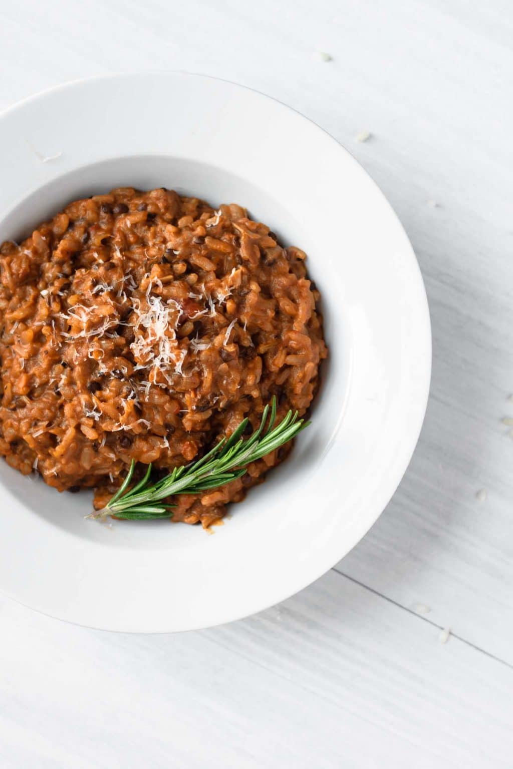 Happy New Year everyone! I’m a little late to the draw here, as we’re officially more than halfway through the month, but I spent the first part of my new year soaking up the sun in Hawaii and it was glorious. I was so not ready to come back home to cold weather, though I did miss our pets! I also owe you a little bit of an apology, as I had meant to share this recipe for vegan risotto bolognese with you before the new year and close on the heels of my mouth watering black lentil bolognese, but it was so delicious I went into a holiday-no work allowed-food coma. Oh well, if you already made a batch of bolognese you’re probably missing it by about now (I know I am!) and ready for round 2 with this delectable risotto!