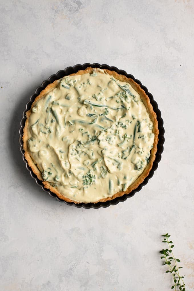 To finish, fill up the blind baked crust with the quiche mixture.