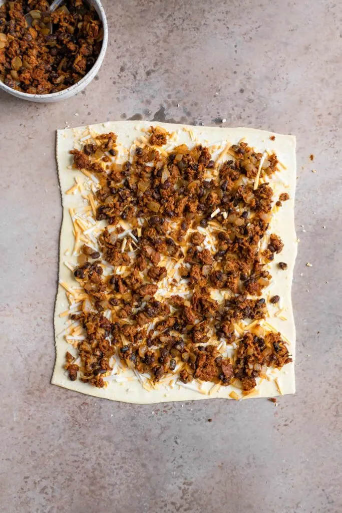 - Roll out a sheet of defrosted puff pastry to about a 10 by 12 inch rectangle. It doesn't need to be exact. Layer on about half the vegan cheese and half the bean and chorizo mixture. Top with half the sliced scallions.