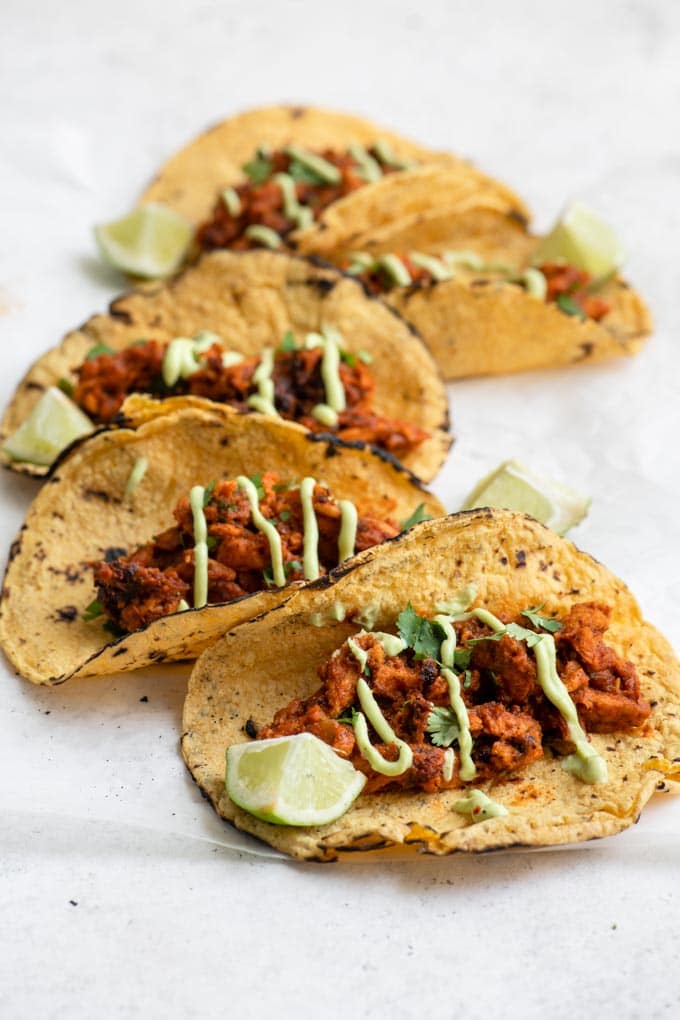 I love serving vegan tinga tacos with a generous heaping of avocado crema and a side of beans and rice to make it a feast.